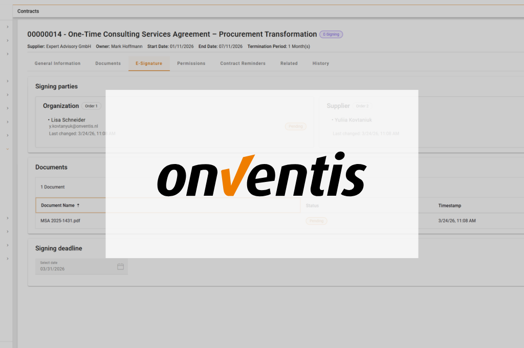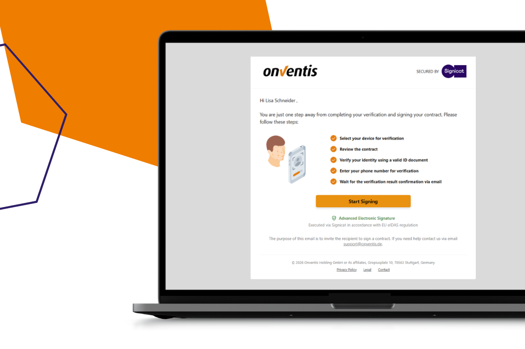 With this new integration, customers will have access to Advanced Electronic Signatures (AES) based on substantial identity verification as a standard feature. The solution is fully embedded within the CLM, allowing users to sign contracts legally and directly within the Onventis system, without relying on external tools or manual intermediate steps. Seamless integration into existing workflows eliminates manual effort and significantly accelerates contract processes. In addition, users benefit from automated audit trails and transparent traceability of the full e-signing process.